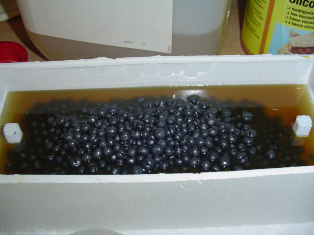 Auf Wunsch von Jo wurden direkt Bleikugeln mit in die Form eingelassen - hierbei wurde in 2 Schichten gearbeitet - erster Guss wurde die Form zu 1/3 gefüllt - aushärten lassen - dann Blei verteilen und weiter volllaufen lassen - somit ist das äußerste nicht von direkten Einschlüssen der Kugeln betroffen - sicherlich kann man auch hier Bleiplatten benutzen - damit entfällt das lästig auftürmen dieser miesen kleinen Kugeln